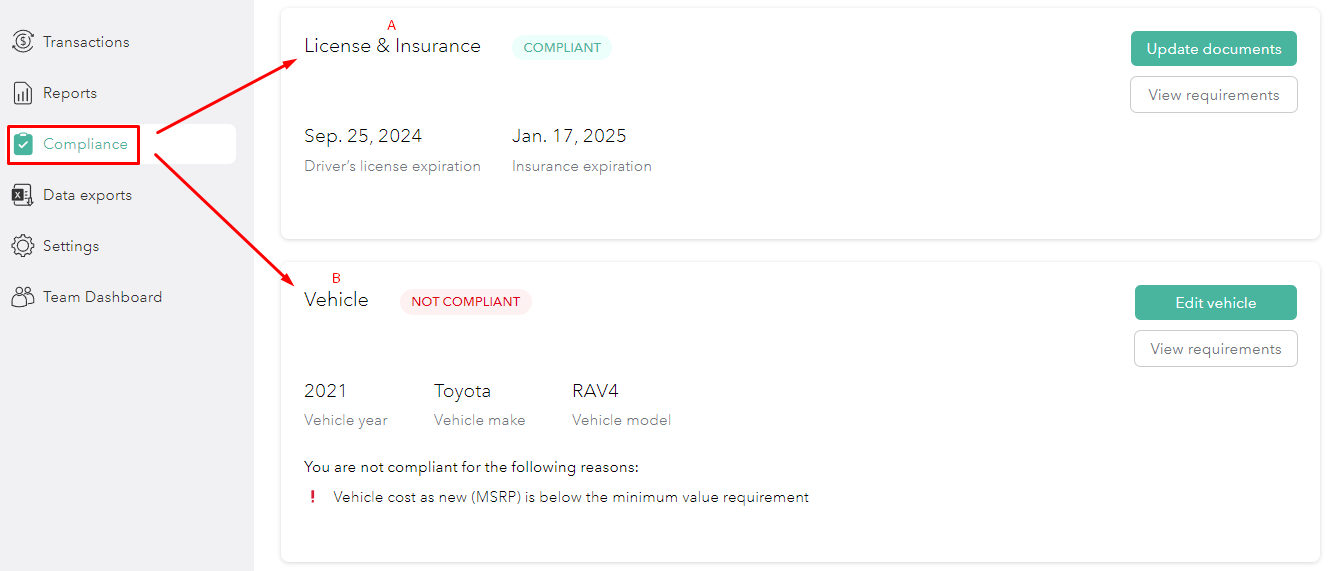 🔔 Reminder: You can see both your Document and Vehicle requirements in the "Compliance" tab by clicking on "View requirements".