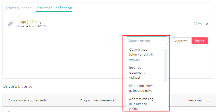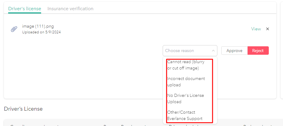 - Driver's License expiration date: Select 'Approve' or 'Reject', and provide a reason for rejecting if it applies.