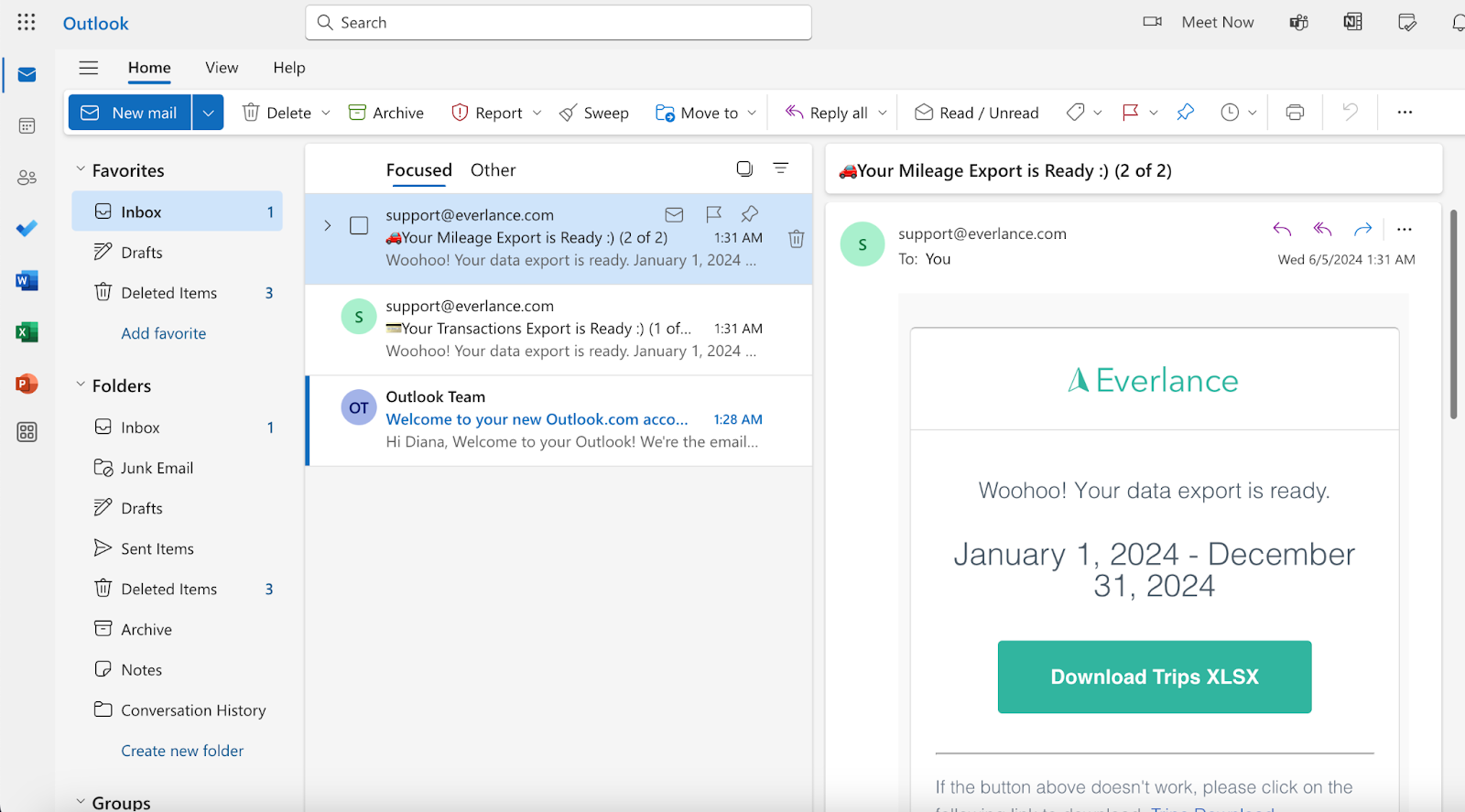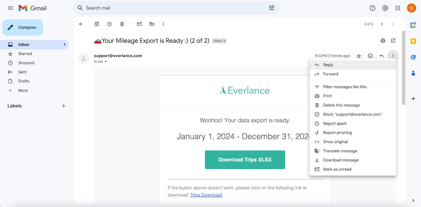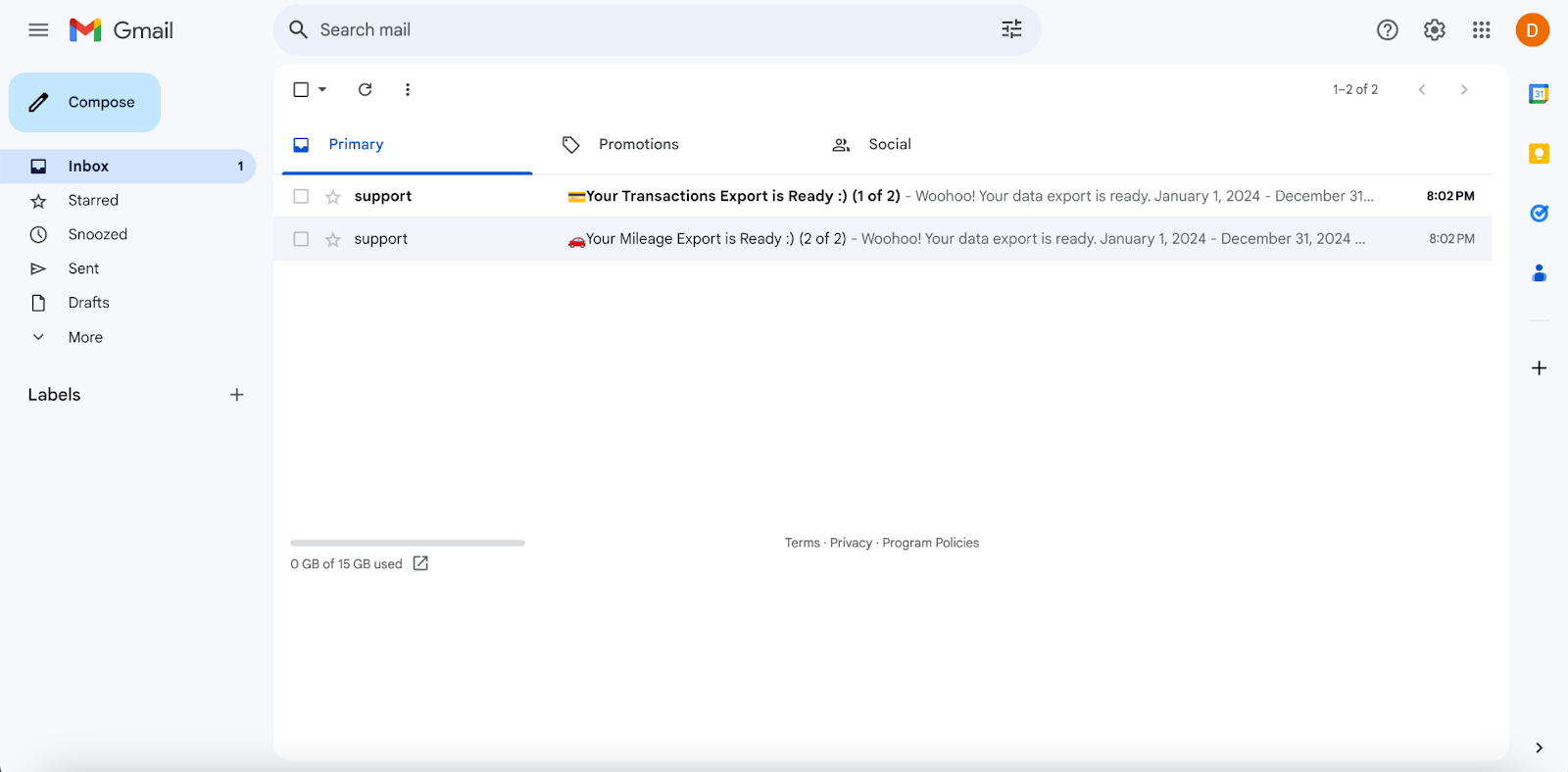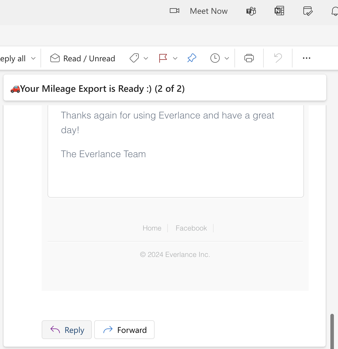 - Mileage Export: 🚗 “Your Mileage Export is Ready :) (2 of 2)”