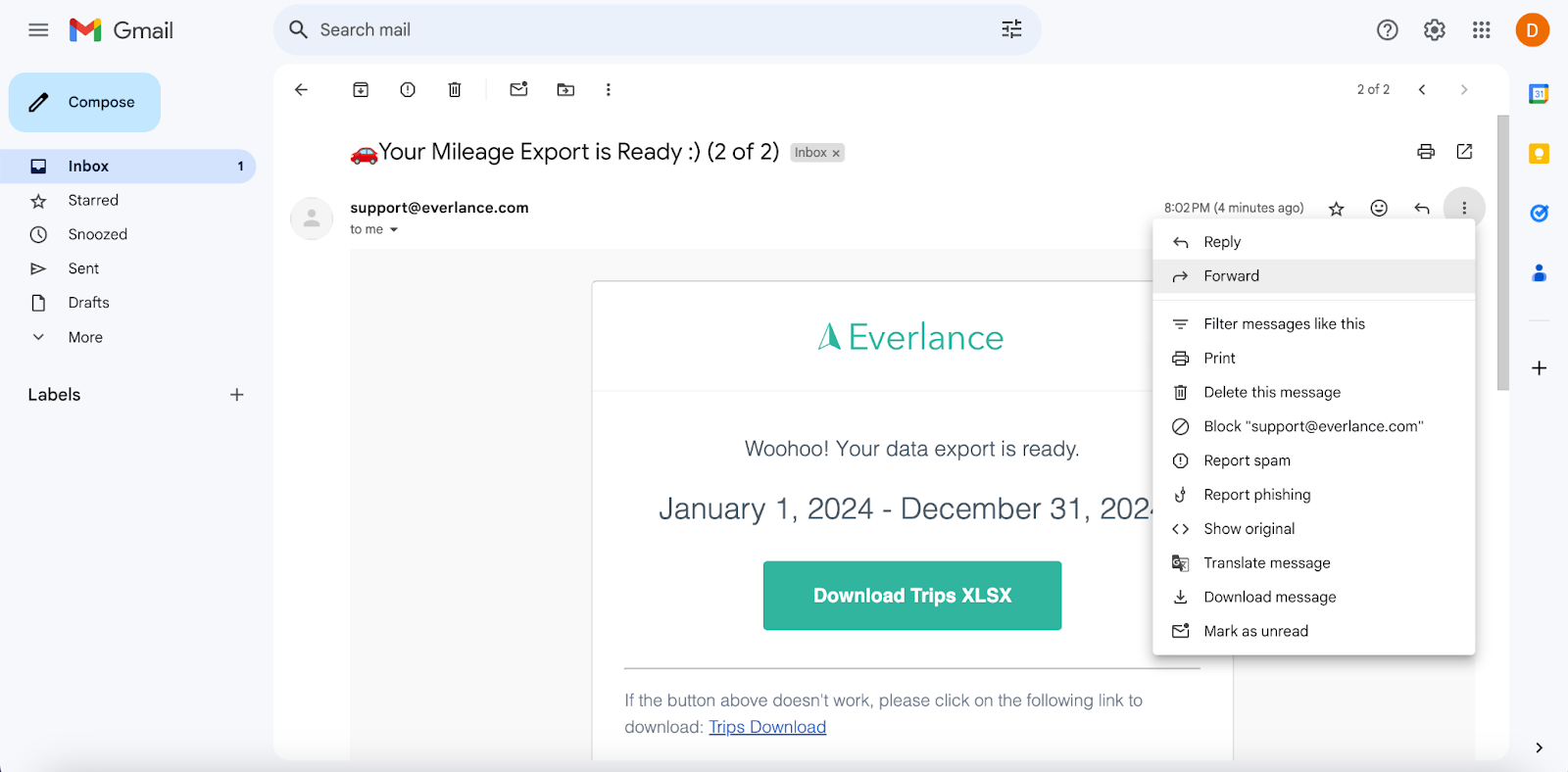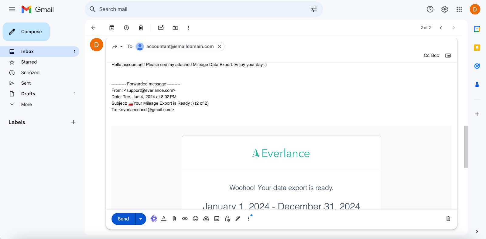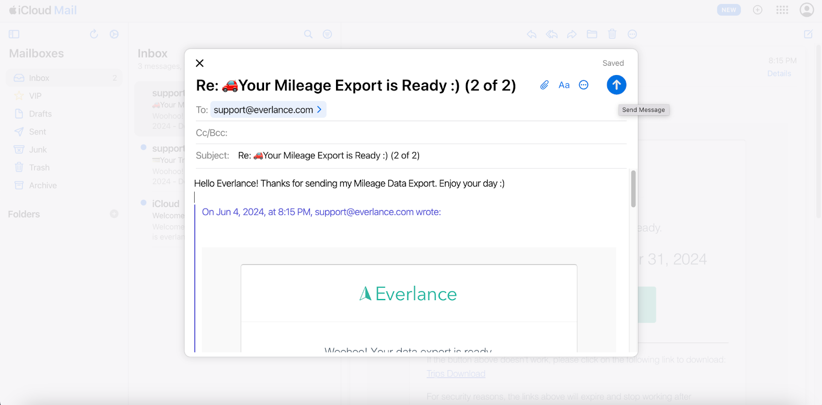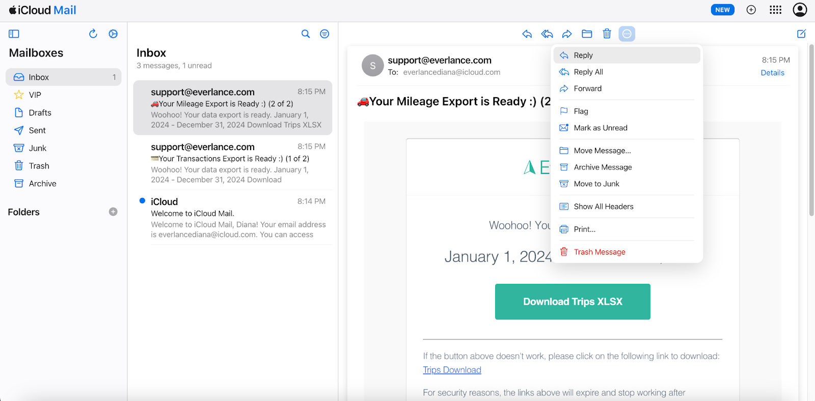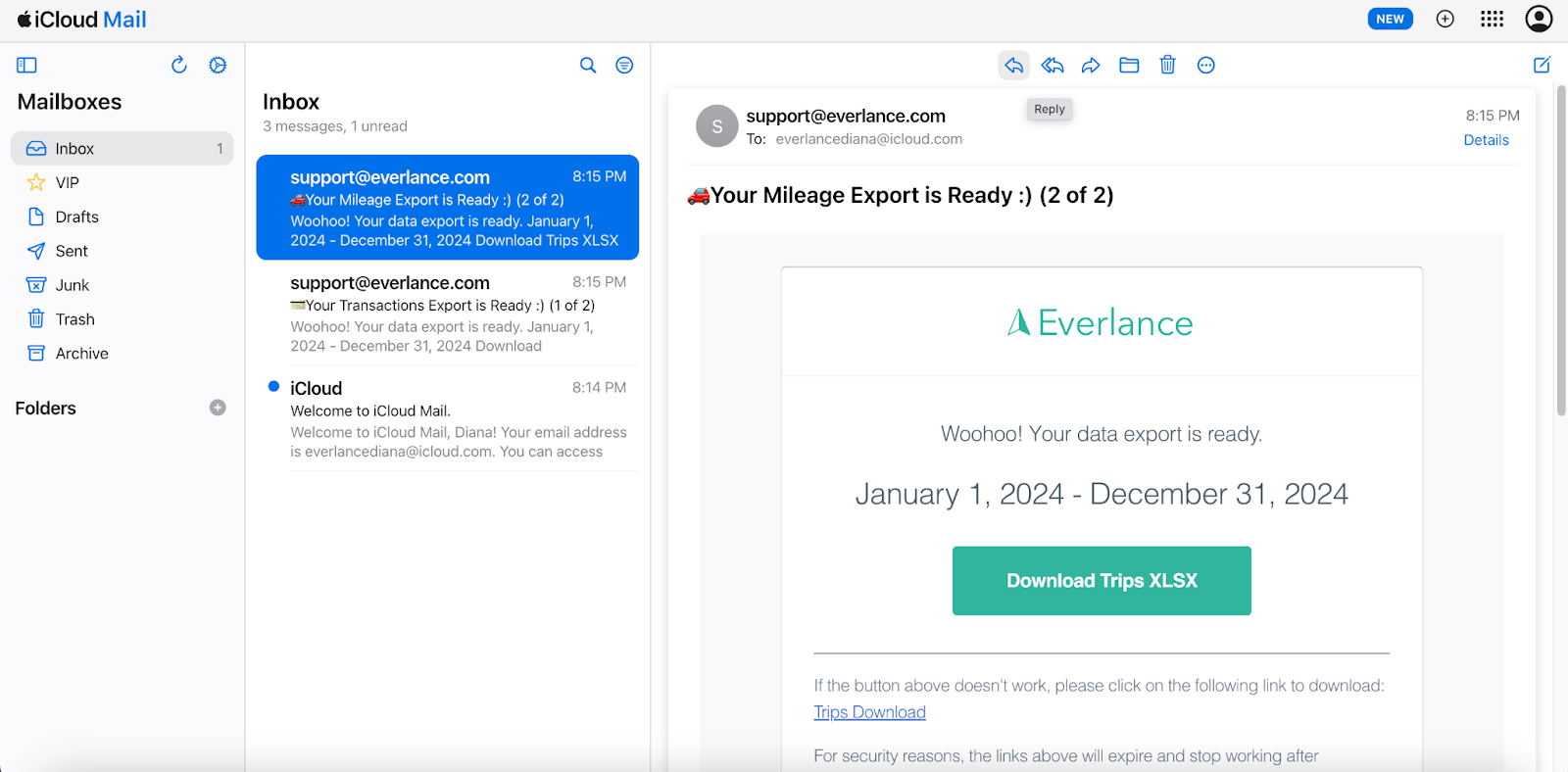 Once you have generated your Data Exports, such as 🚗 Mileage (aka Trips) and/or 💳 Transactions (aka Expenses and/or Revenues) from the Everlance app or dashboard, they'll be sent to your email (Gmail, Yahoo, Hotmail, Outlook, AOL, iCloud, etc). You can then Reply to or Forward these emails.
