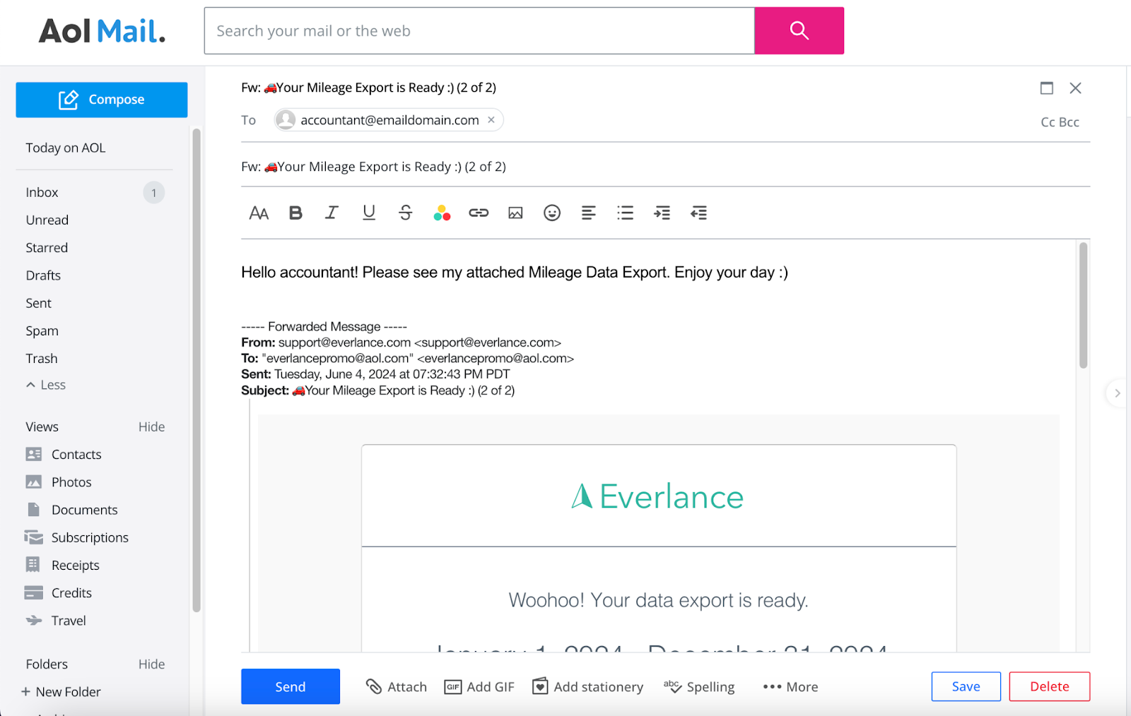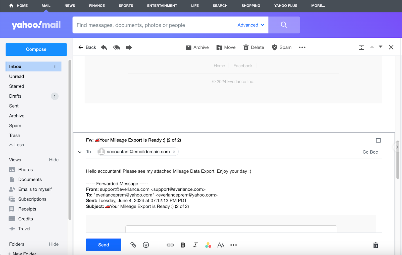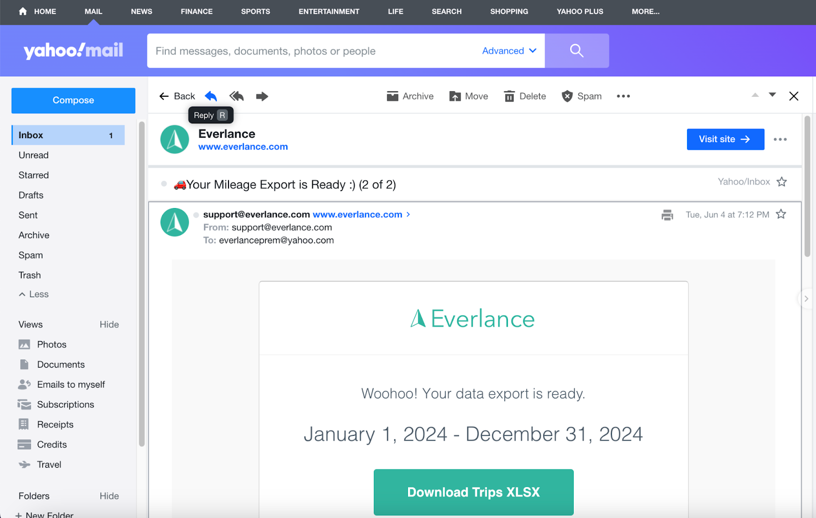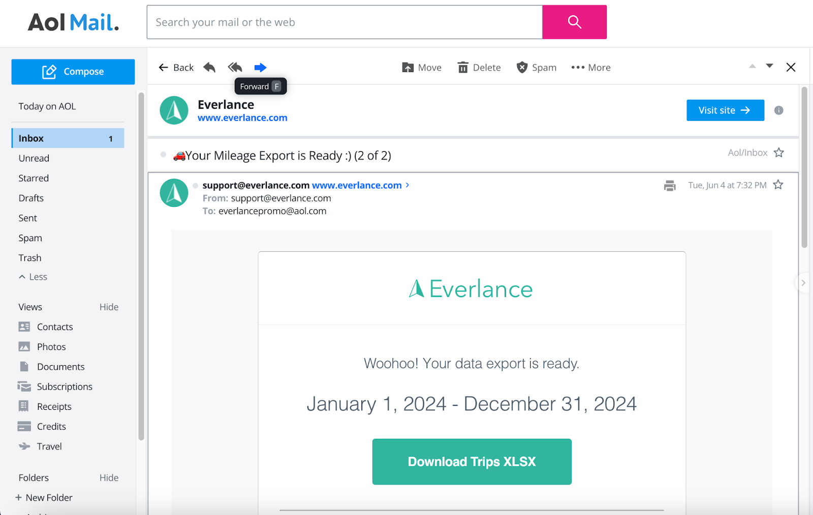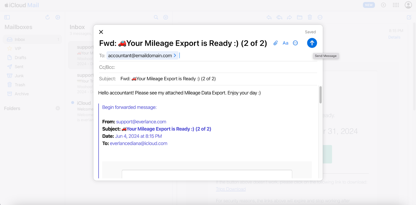 Once you have generated your Data Exports, such as 🚗 Mileage (aka Trips) and/or 💳 Transactions (aka Expenses and/or Revenues) from the Everlance app or dashboard, they'll be sent to your email (Gmail, Yahoo, Hotmail, Outlook, AOL, iCloud, etc). You can then Reply to or Forward these emails.