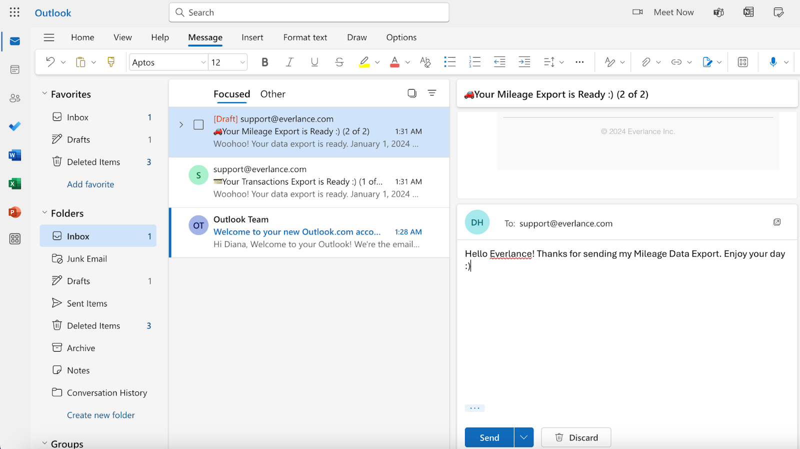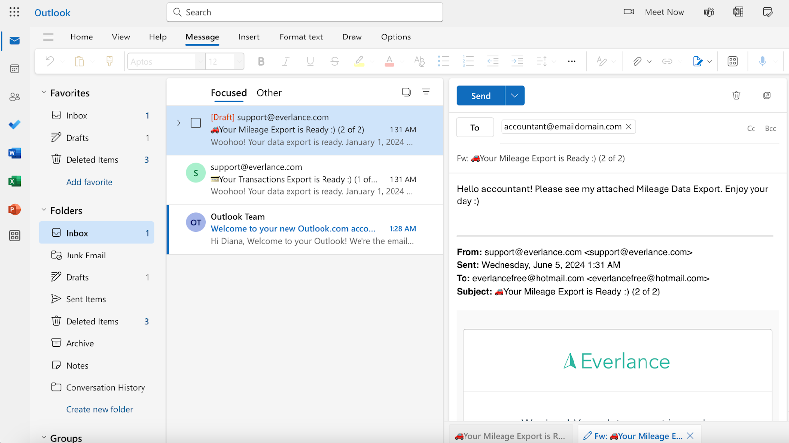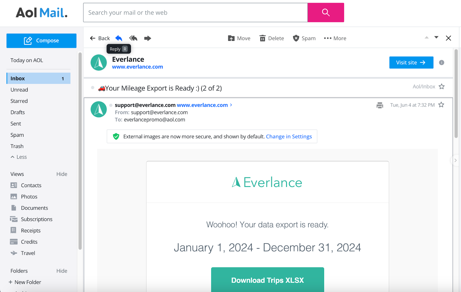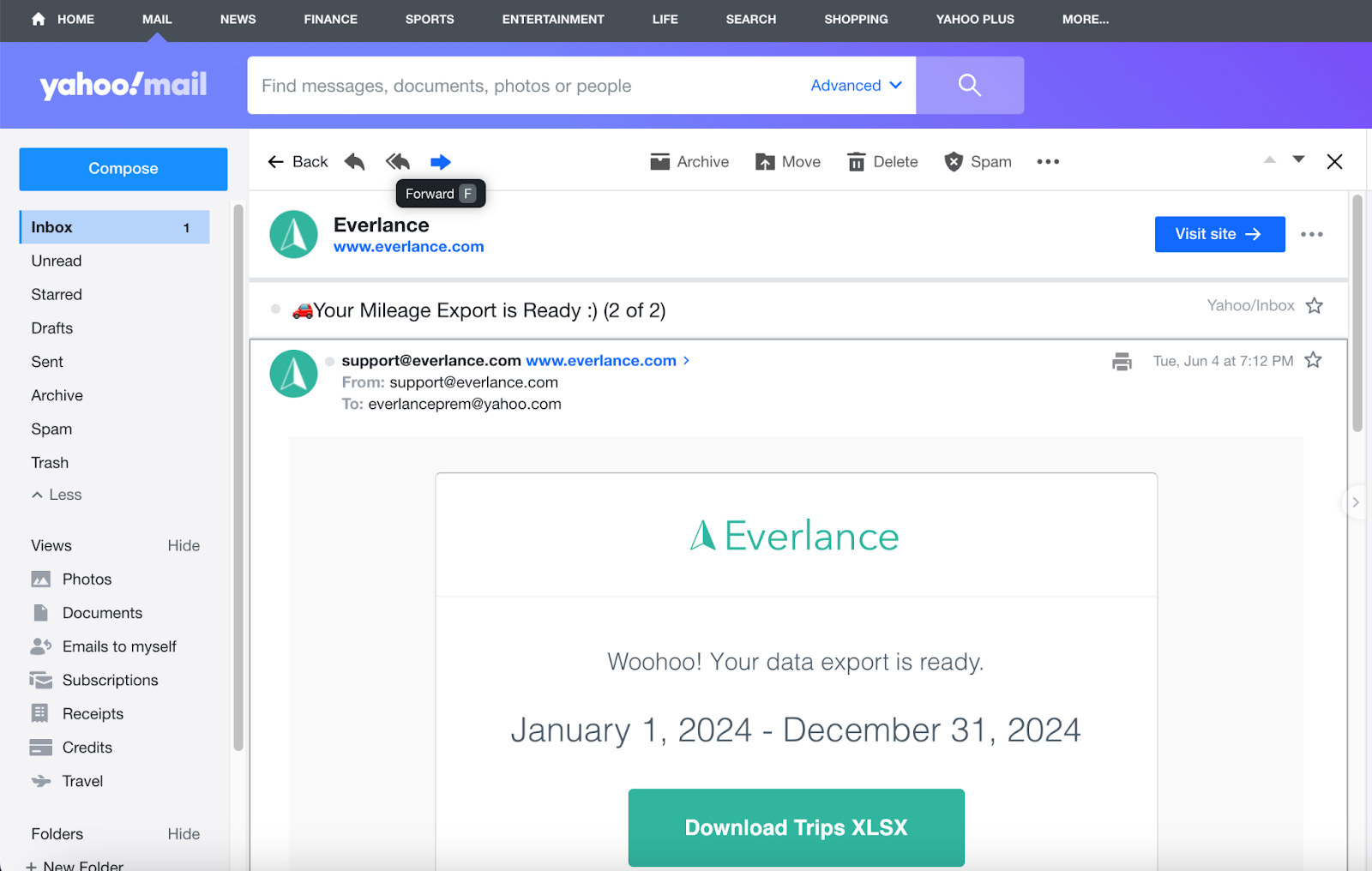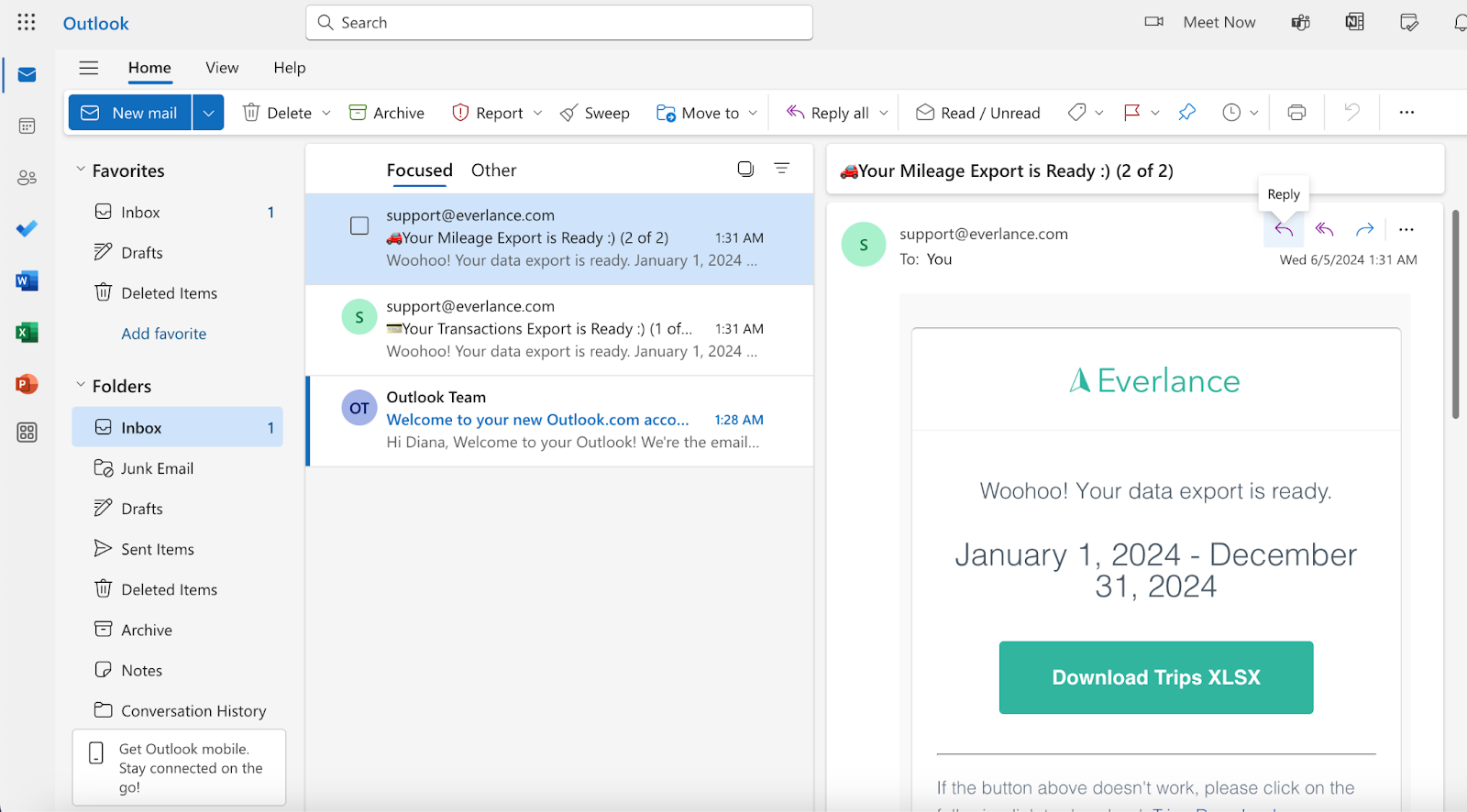 Once you have generated your Data Exports, such as 🚗 Mileage (aka Trips) and/or 💳 Transactions (aka Expenses and/or Revenues) from the Everlance app or dashboard, they'll be sent to your email (Gmail, Yahoo, Hotmail, Outlook, AOL, iCloud, etc). You can then Reply to or Forward these emails.