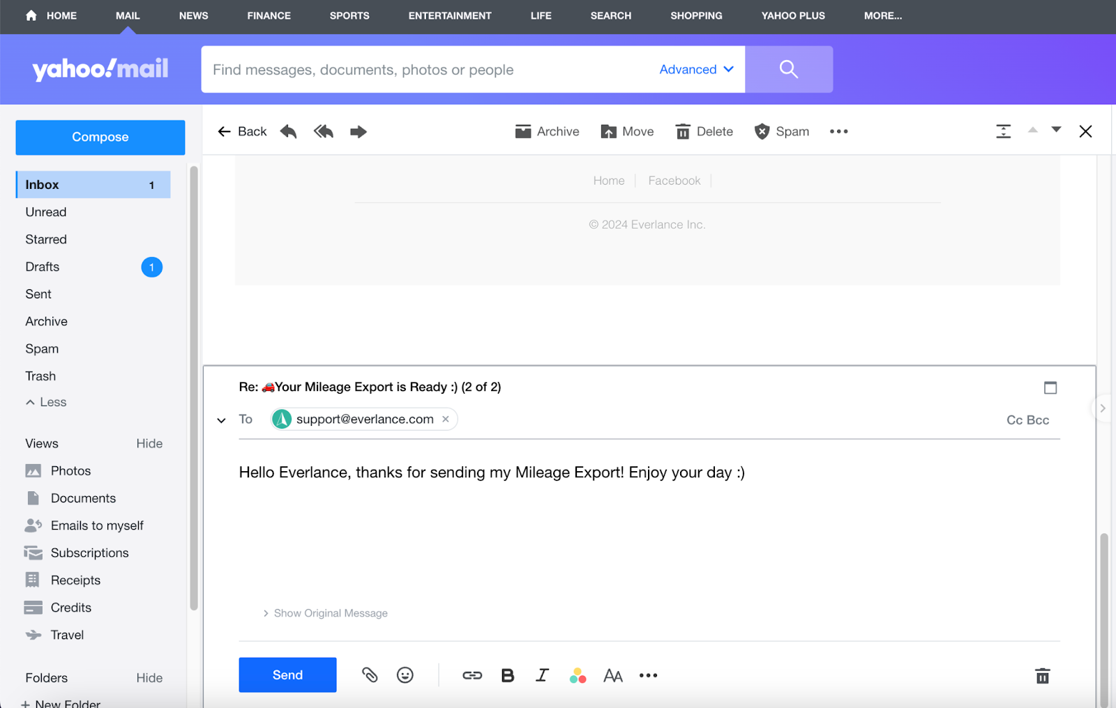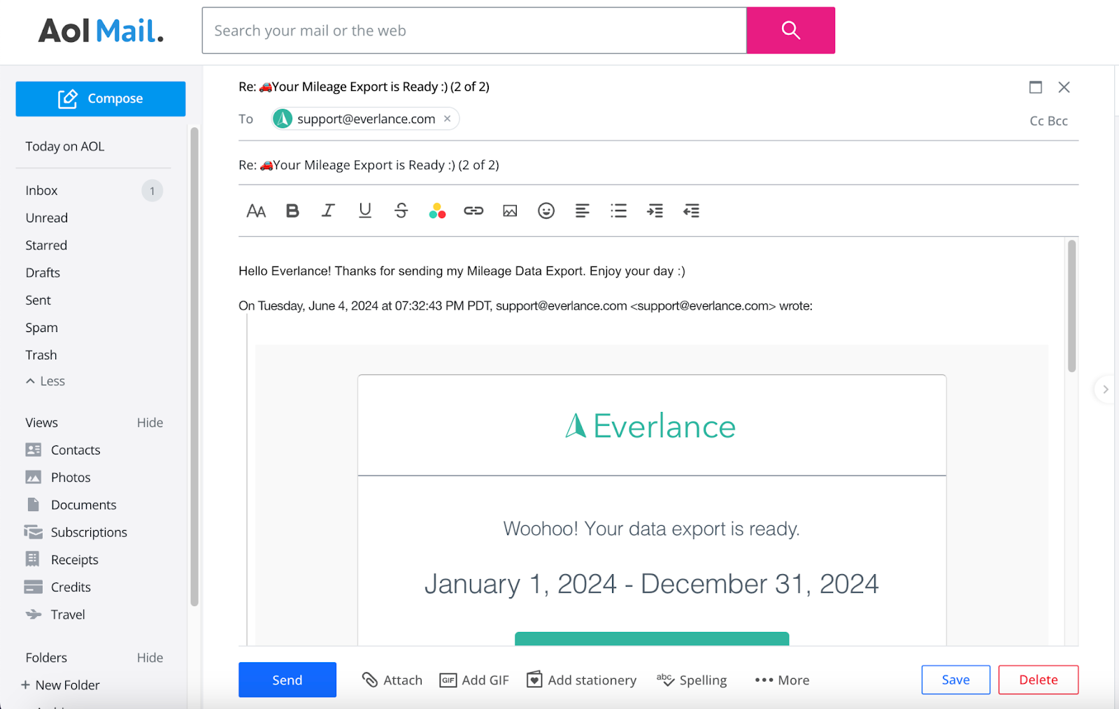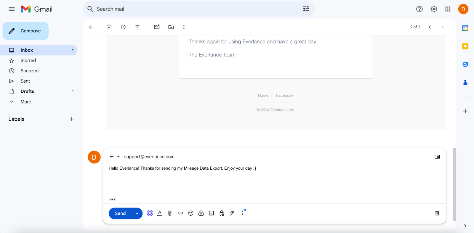 - If you have questions or concerns about your Data Exports, Reply to the email or Forward it to support@everlance.com. We’ll assist you!