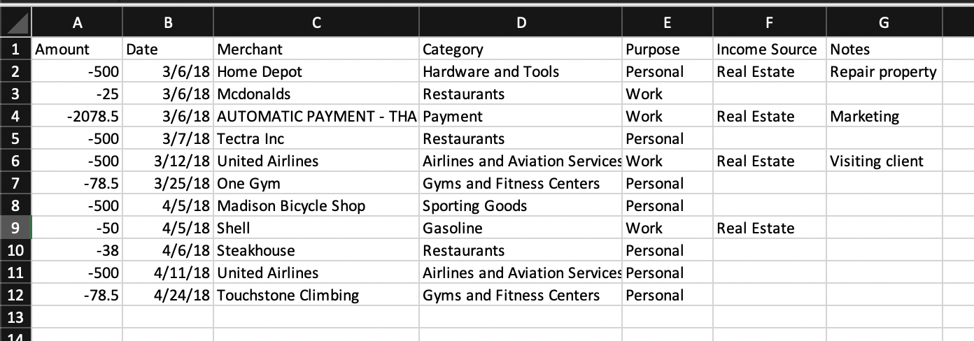 Step 1: Create an Excel spreadsheet with the following column names: Amount, Date, Merchant, Category, Purpose, Income Source, and Notes