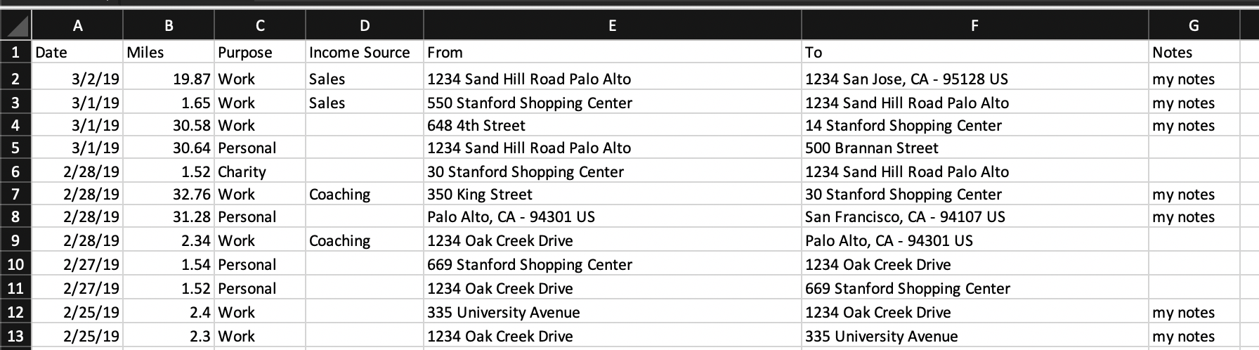 Step 1: Create an Excel spreadsheet with the following column names: Date (mm/dd/year format), Miles, Purpose, Income Source, From, To, Notes.